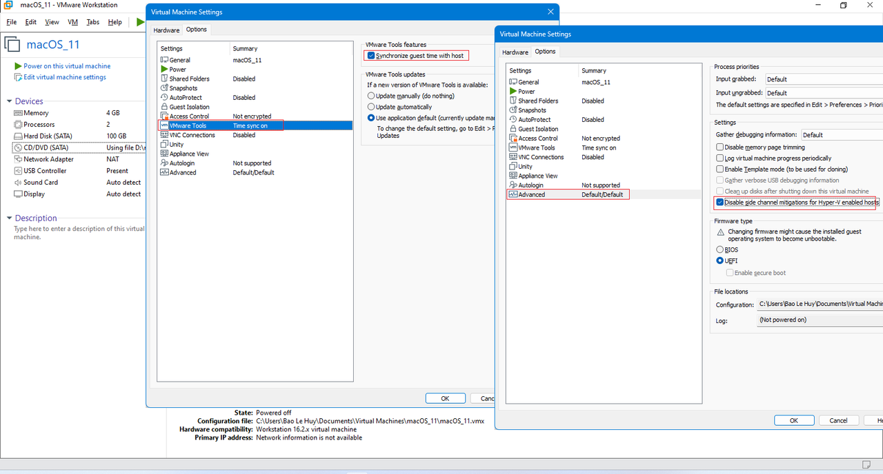 + Chỉ bật tính năng hỗ trợ cho macOS bị tắt trong VMware để chạy trên Phần cứng của Apple.
